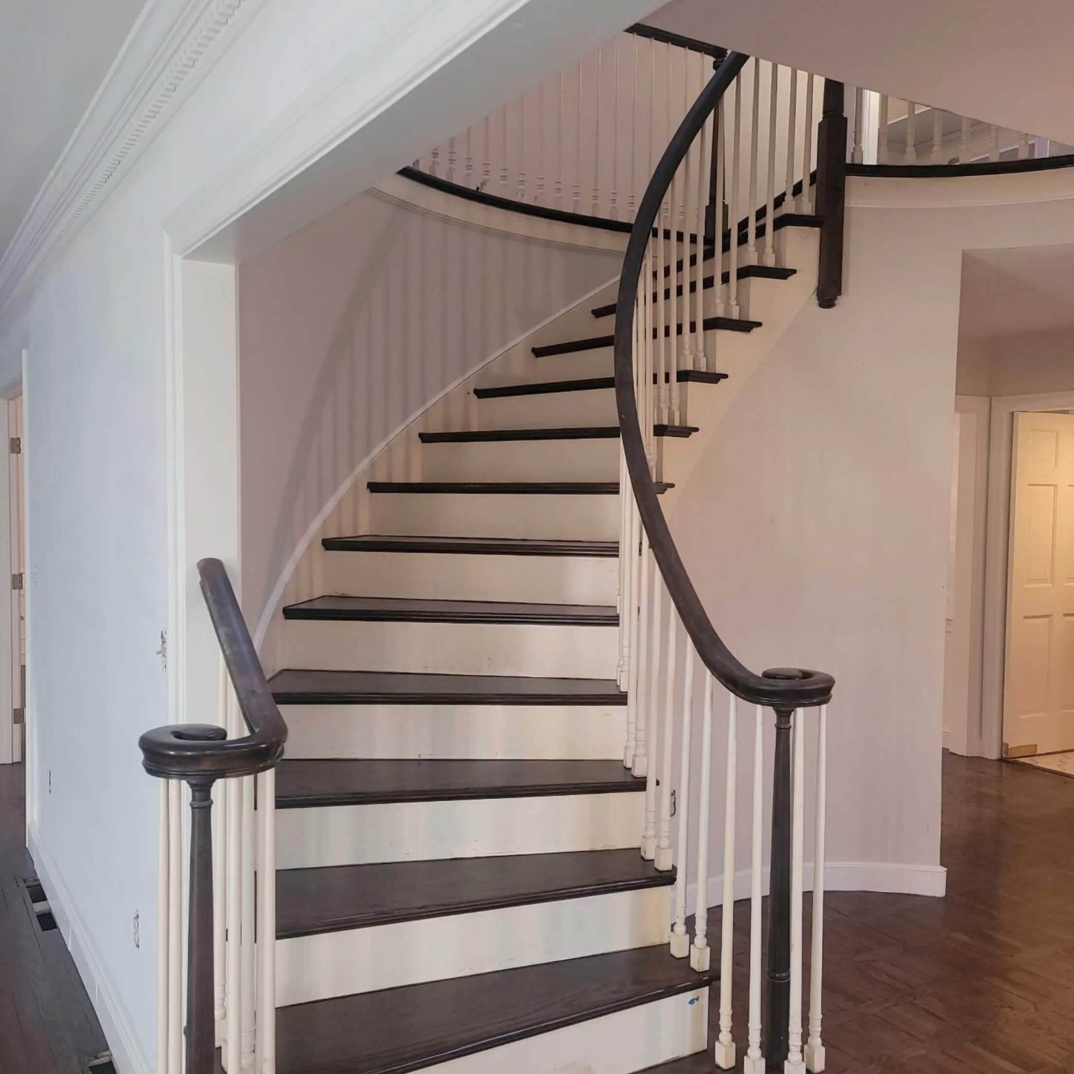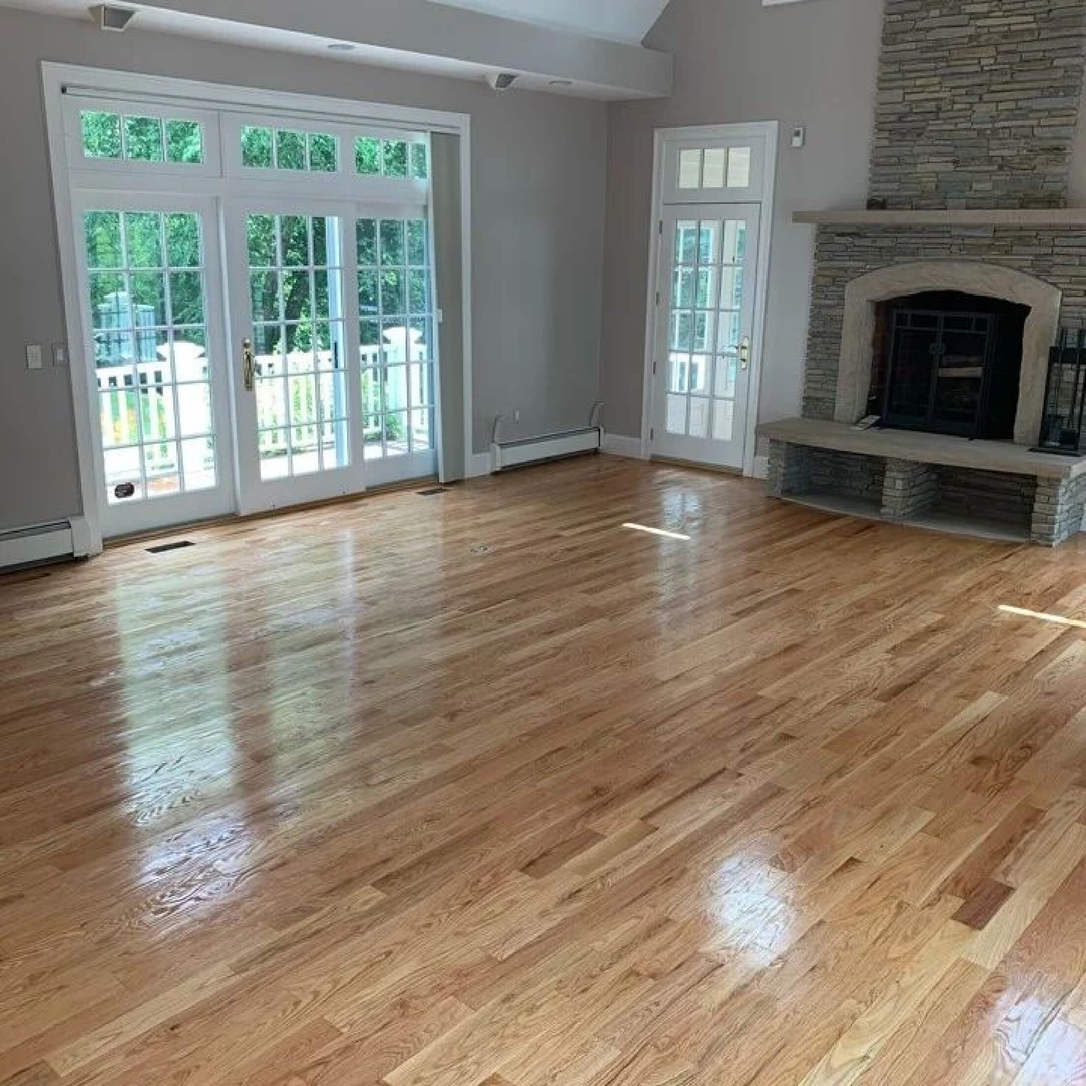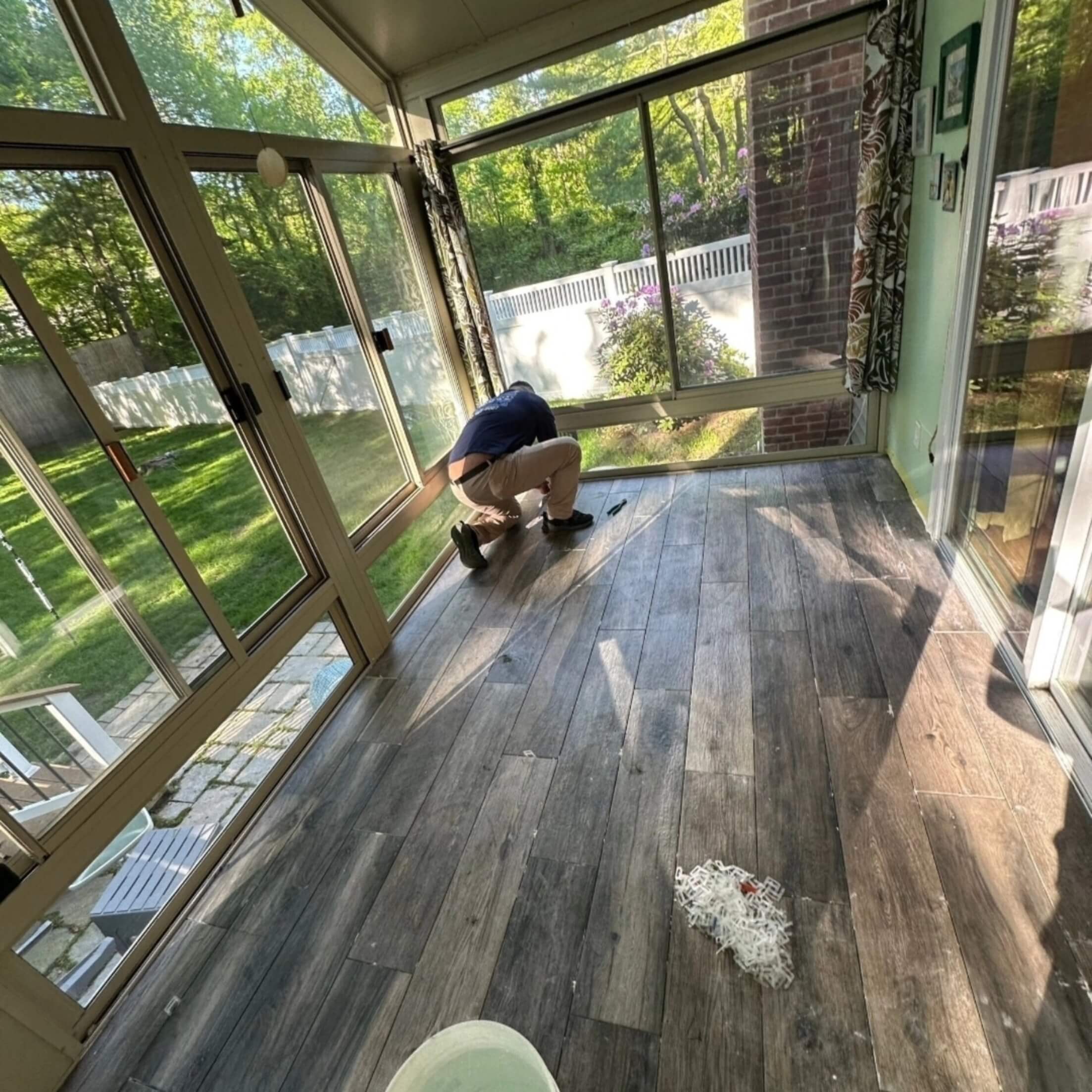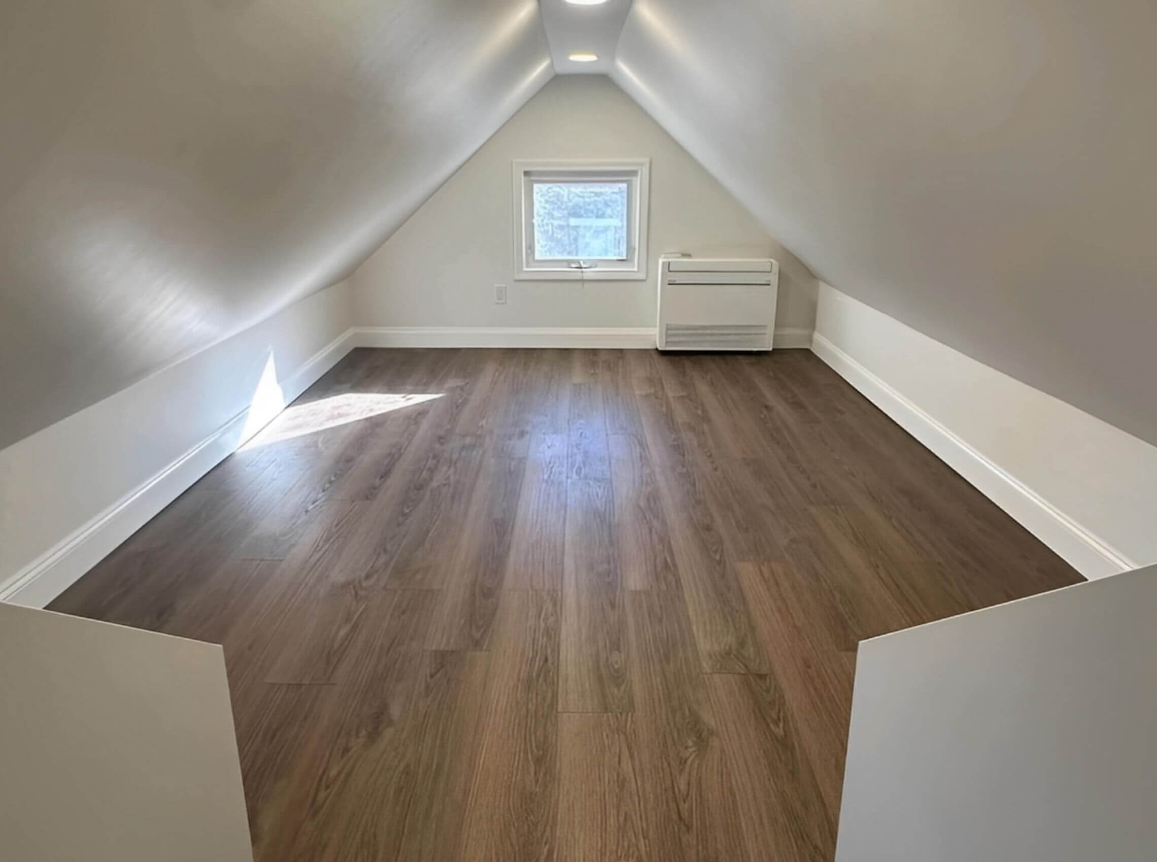 Warm toned flooring bathroom on side from basement remodeling Framingham MA project